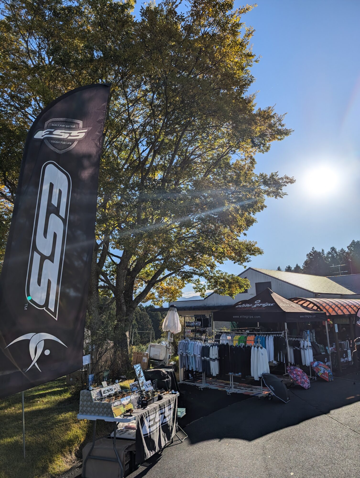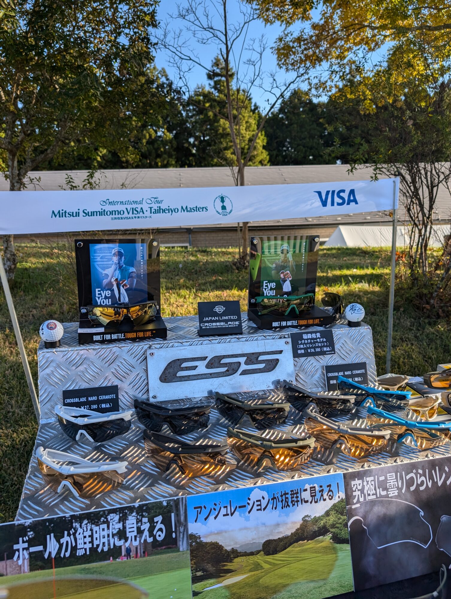 ESSブースは、クラブハウス前の正面グリーン練習場前に出展し、サポートプロゴルファーが使用するシグネチャーモデ「出水田大二郎モデル」、「稲森佑貴モデル」を始め、プロゴルファーやツアープロキャディの間で使用者が多い、ESS CROSSBLADEアイシールドCERAKOTEモデルを中心に展示を致しました。