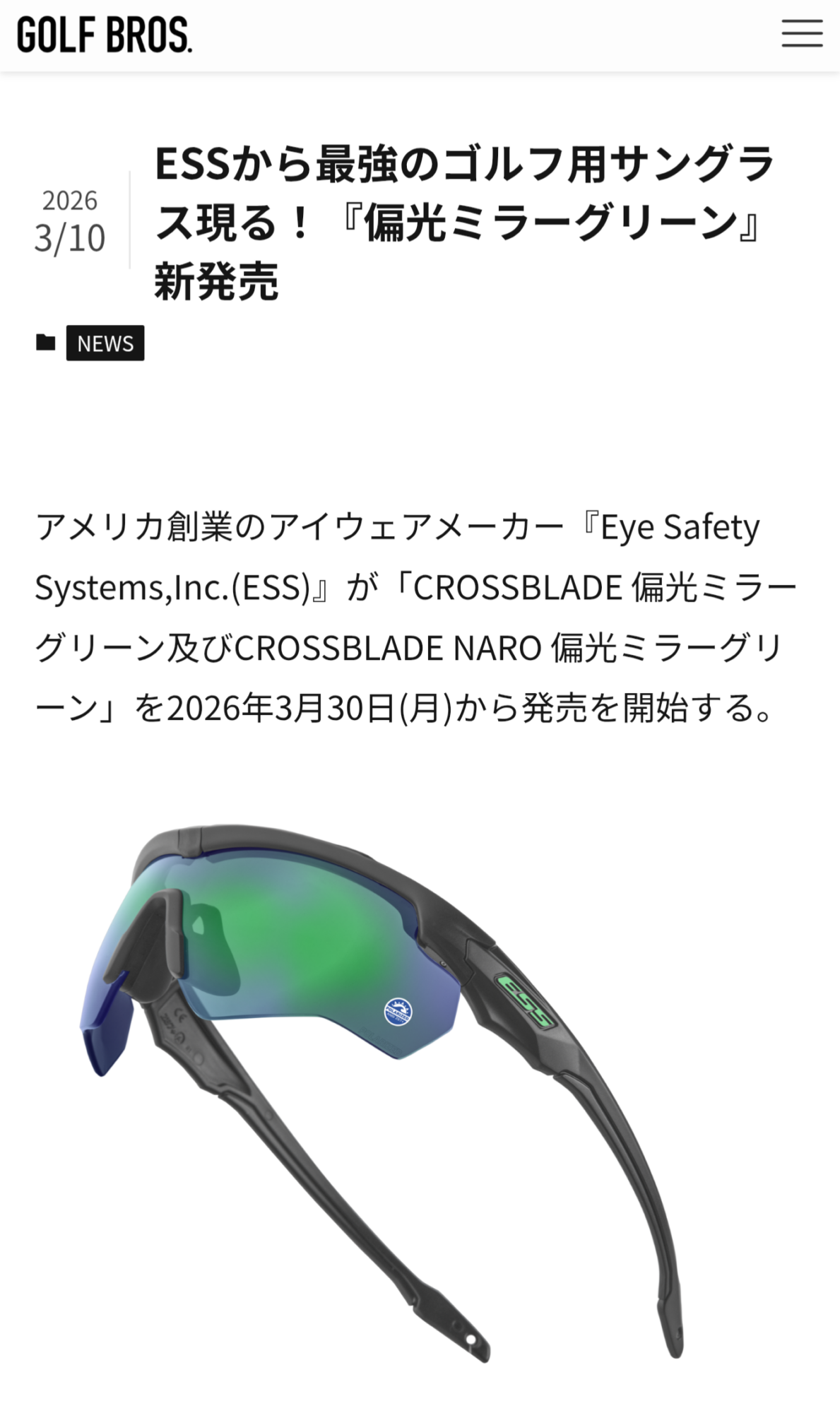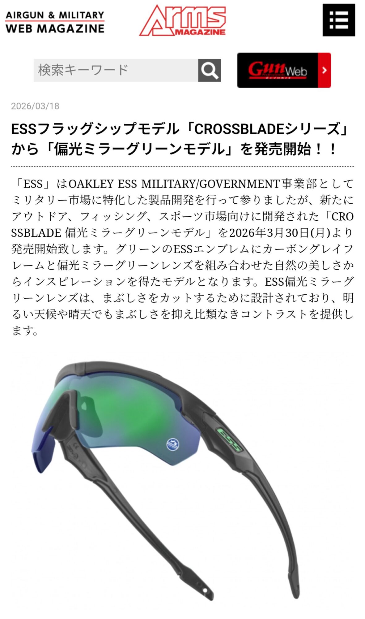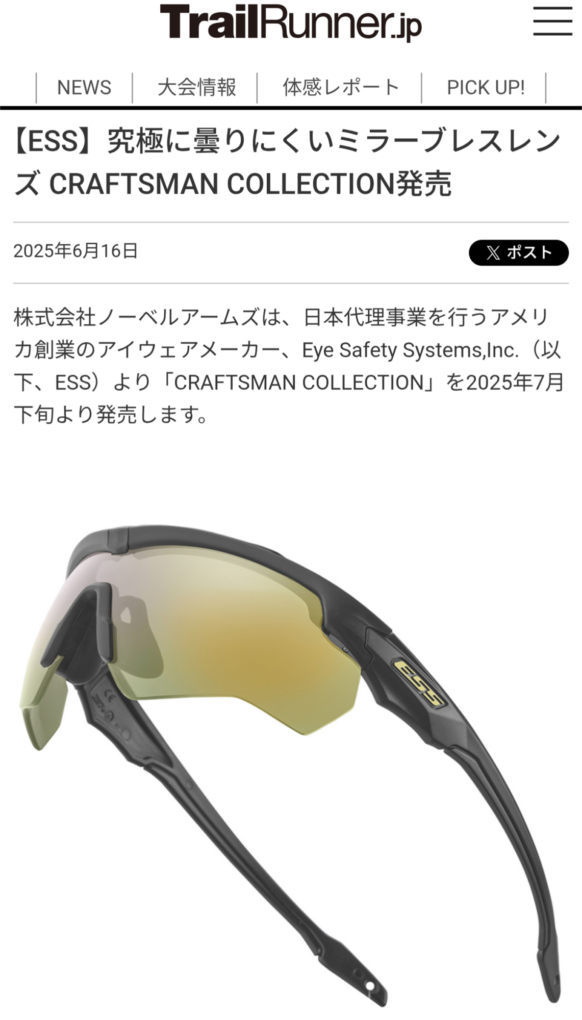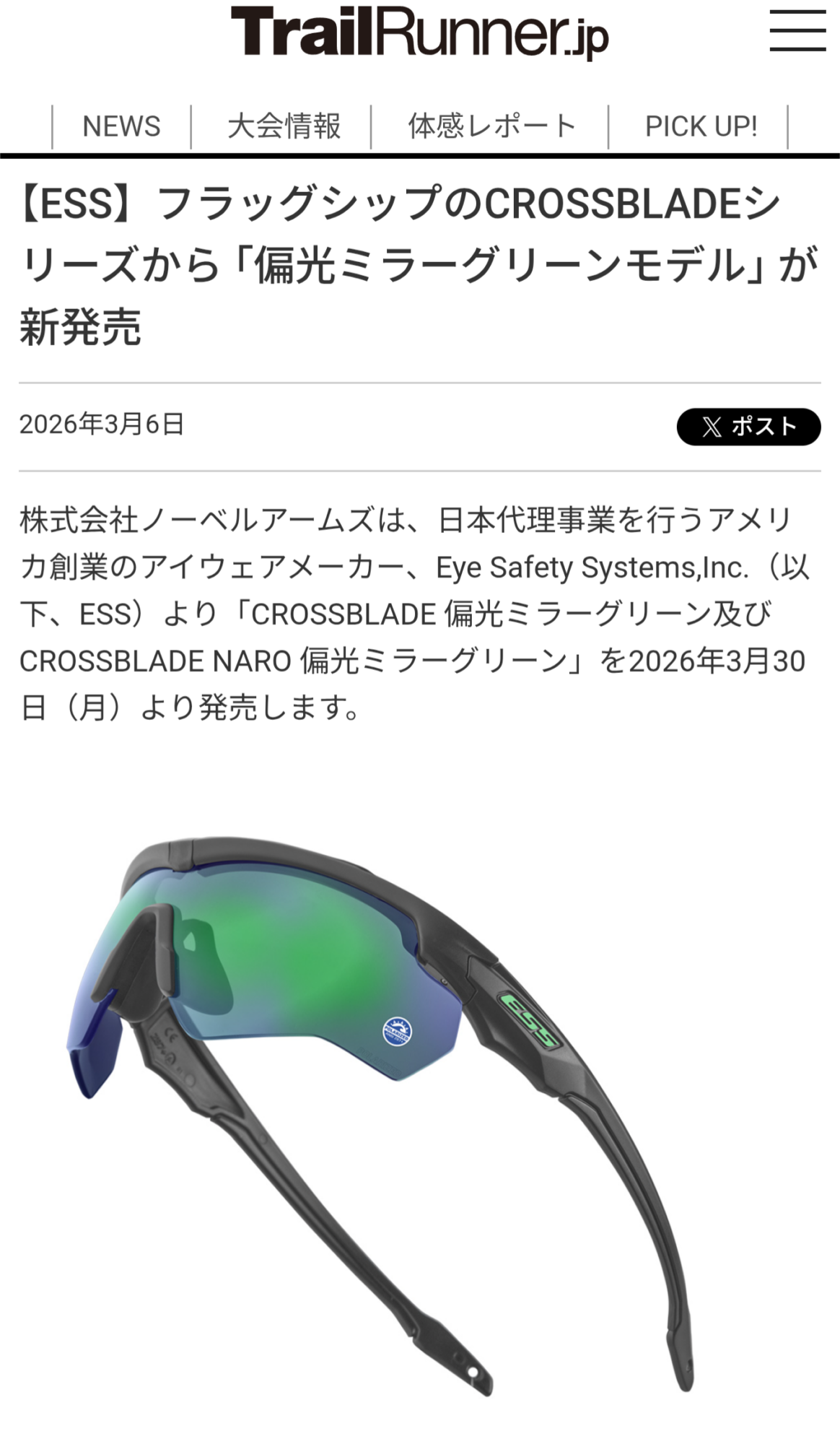 ■トレイルランニング総合情報サイトの「TrailRunner.jp」にESS新製品が紹介されました。 2026年03月19日 【ESS】フラッグシップのCROSSBLADEシリーズから 「偏光ミラーグリーンモデル」 が新発売